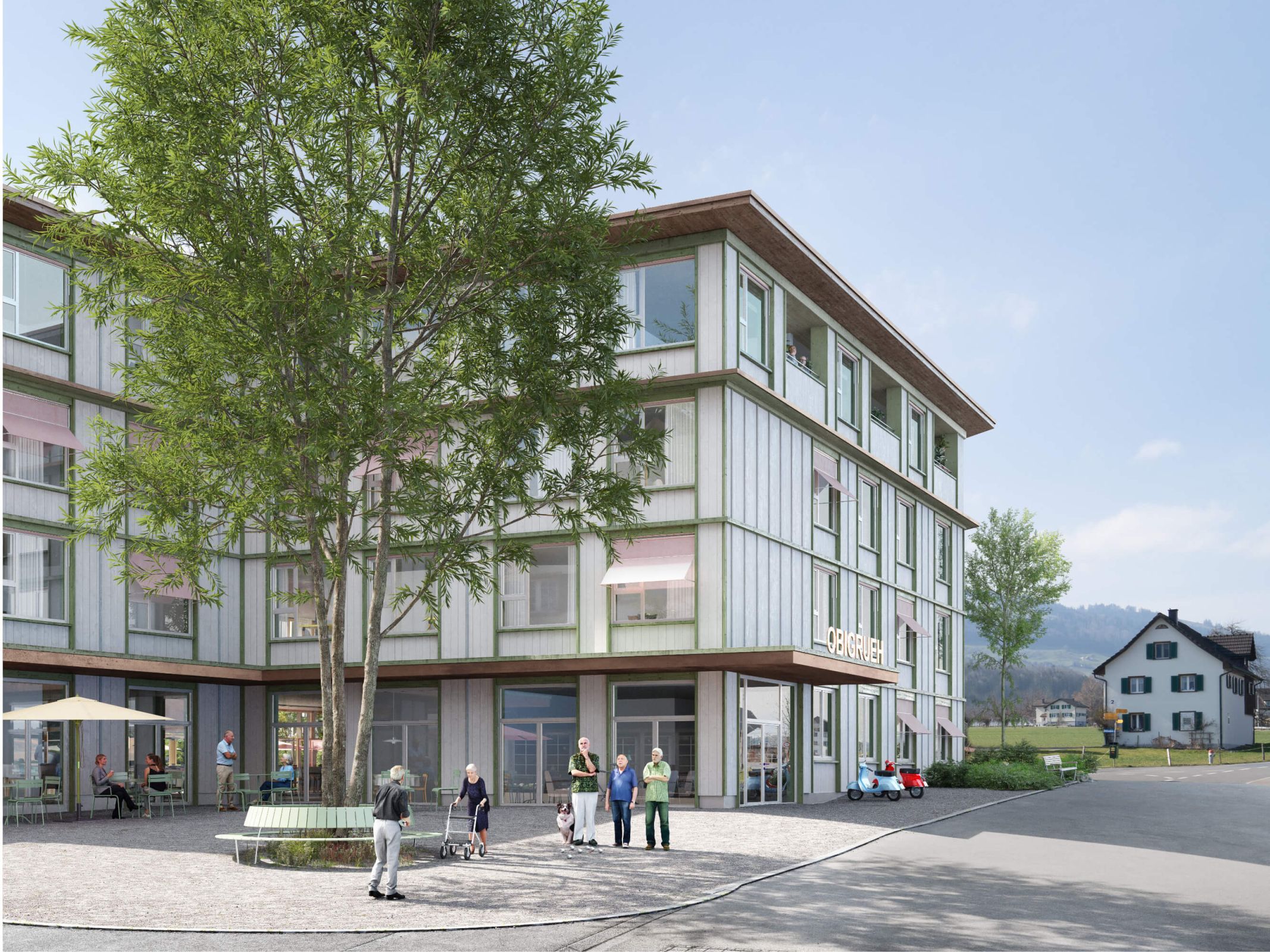 Als Ankerpunkt und Auftakt fungiert die bestehende Buchengruppe. Selbstbewusst umschliesst der Eingangstrakt mit Restaurant den Platz und markiert eine hohe Präsenz zum Dorfzentrum. Weil das Alterszentrum nicht nur ein Wohnheim ist, sondern auch ein Café, einen Laden und Wohnungen hat, ist es ein öffentliches Haus. Dies soll betont und ausgebaut werden. Der Haupteingang wird an die Strasse geschoben und der Platz mit Café hat das Potential, zu einem Treffpunkt im Quartier zu werden.