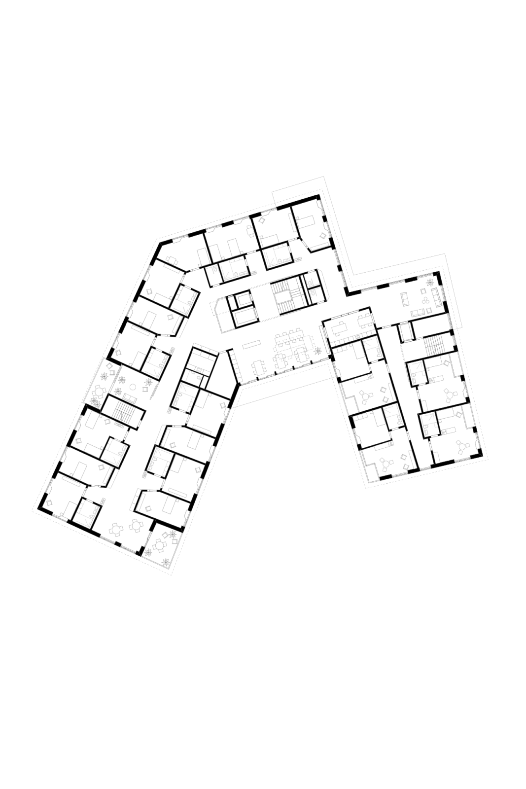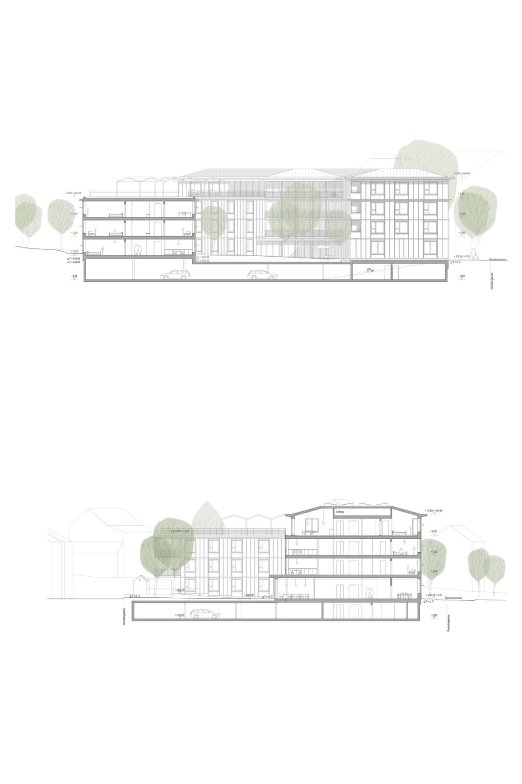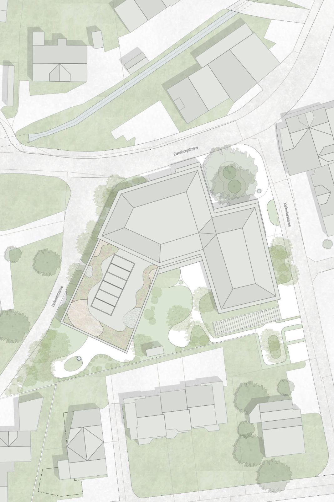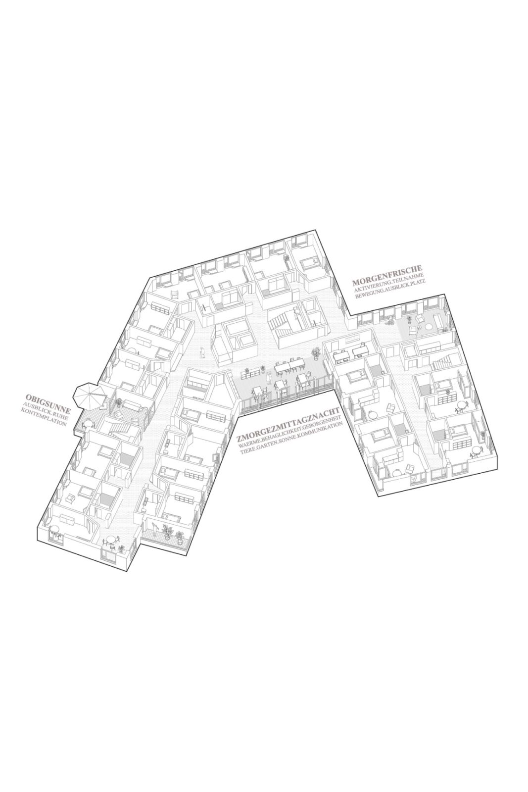 Die Gebäudefigur entwickelt sich entsprechend der Erdgeschossnutzung vom öffentlichen in die privateren, rückwärtigen Bereiche des Grundstücks. Finden sich entlang der Wohnstrasse im viergeschossigen Ostflügel der autonome Hauszugang der Wohnungen, die Anlieferung und Küche, so orientiert sich der dreigeschossige Westflügel mit den Pflegewohngruppen zum verkehrsberuhigten, beschaulichen Siedlungsrand. Dazwischen spannt sich ein kleiner, besonnter Gartenhof auf, welcher einen intimen Rahmen bietet und von den Cafébesuchern ebenfalls genutzt werden kann.
