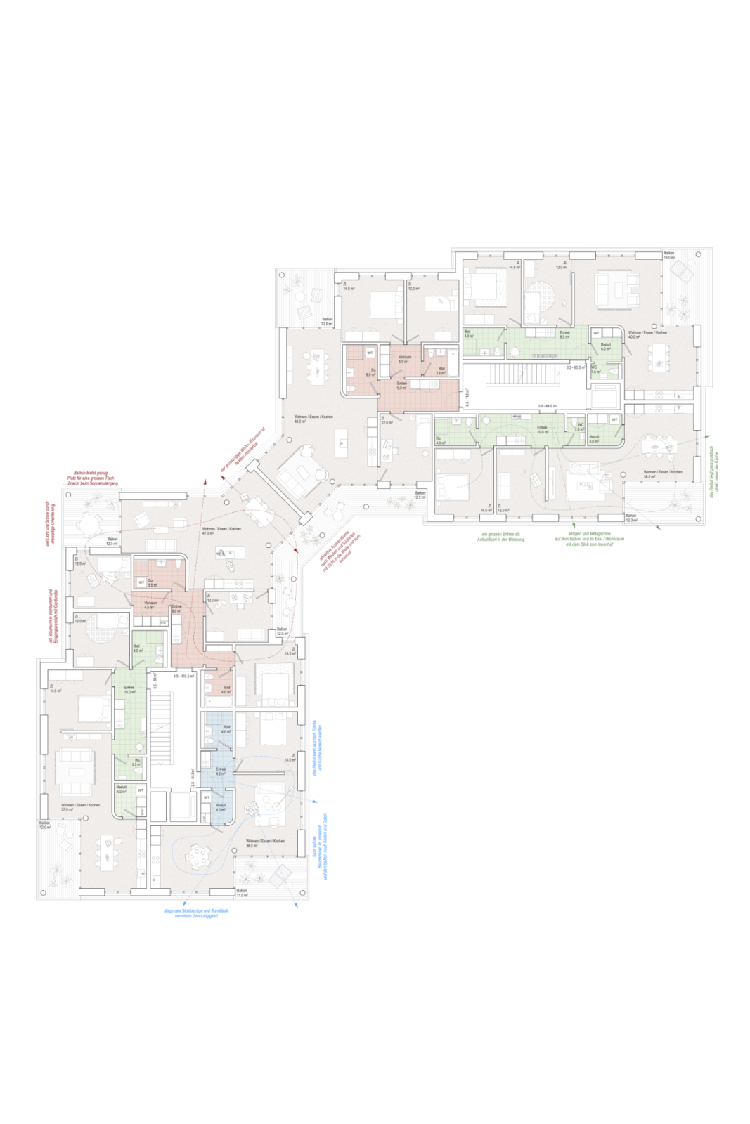 Die Grundrissstruktur der Wohnungen basiert auf klar gegliederten Raumfolgen, wobei mehrfach orientierte Wohnbereiche mit grosszügigen Aussenräumen kombiniert werden. Der Fokus liegt auf räumlicher Grosszügigkeit, funktionaler Organisation und hoher Wohnqualität.