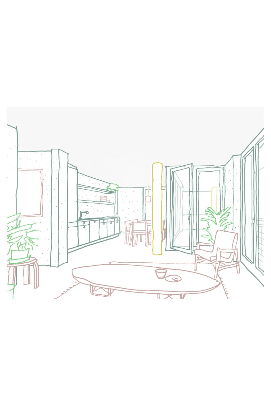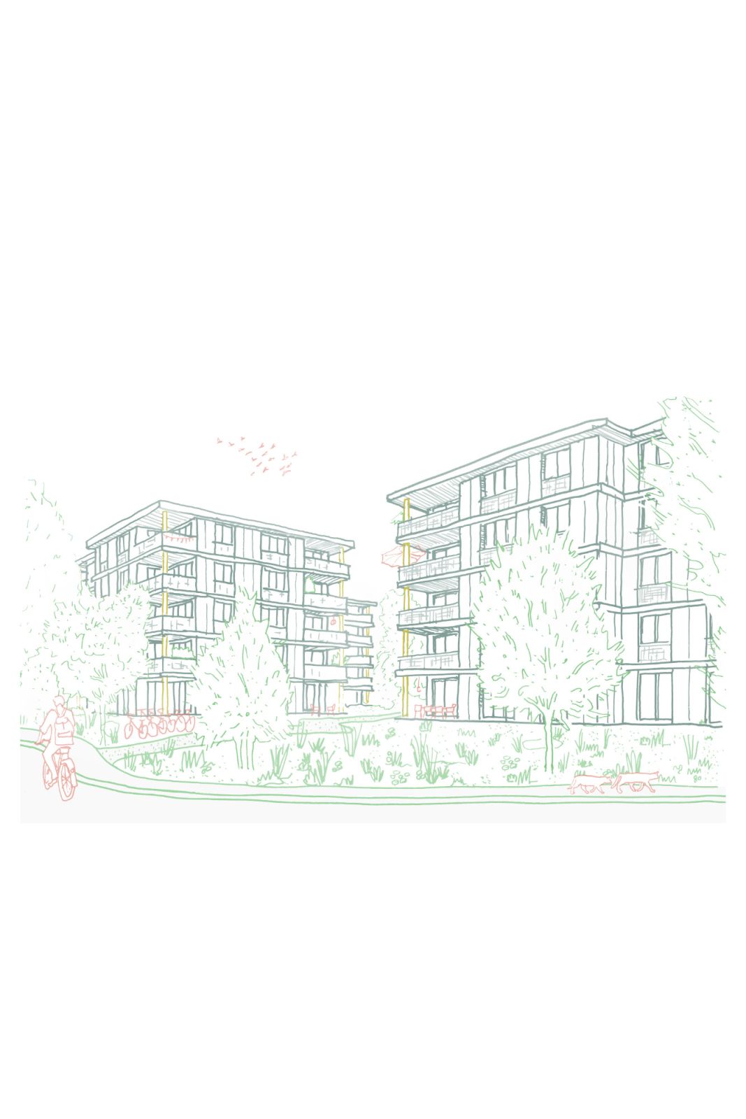 Der Freiraum entwickelt sich schalenartig von aussen nach innen: Eine grüne Filterzone an der Peripherie bildet den Übergang zum Quartier, während der zentrale Hof als offene, multioptionale Mitte konzipiert ist. Durch die gezielte Positionierung der Wohnungseingänge innerhalb des Hofs wird dieser aktiviert und fördert nachbarschaftliche Interaktion.