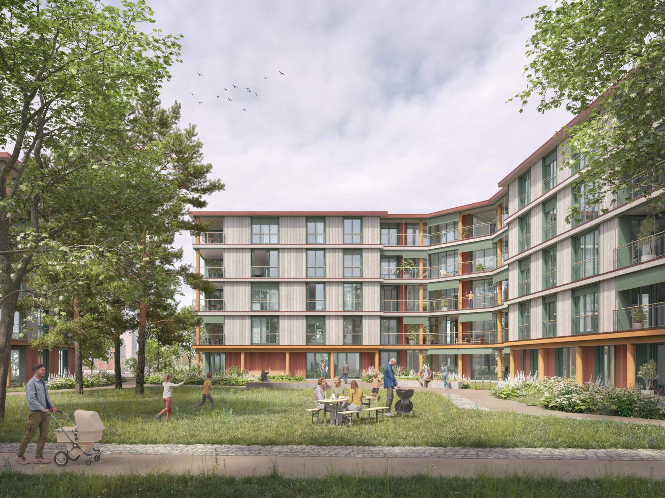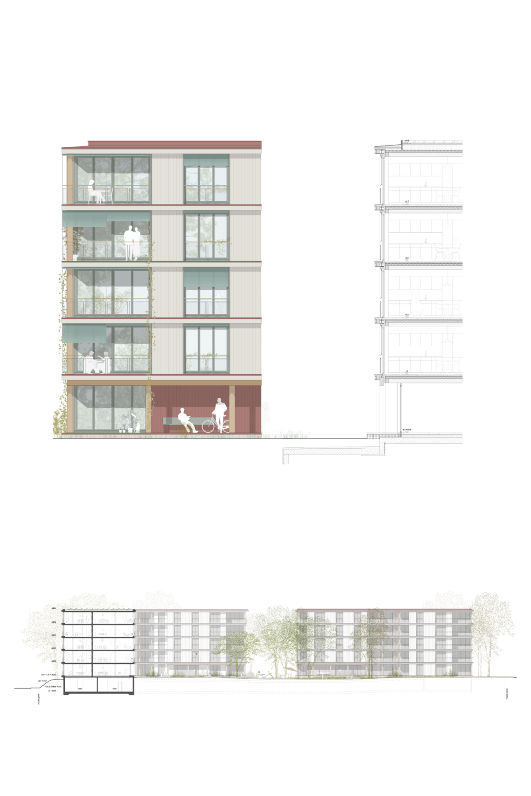 Die städtebauliche Figur greift Elemente der bestehenden Bebauung auf, interpretiert sie jedoch mit einer zeitgemässen Architektursprache in Holz. Die Fassadengliederung durch horizontale Bänder, vertikale Lisenen und eine differenzierte Farbigkeit schafft ein lebendiges Bild im Zusammenspiel mit dem Baumbestand.