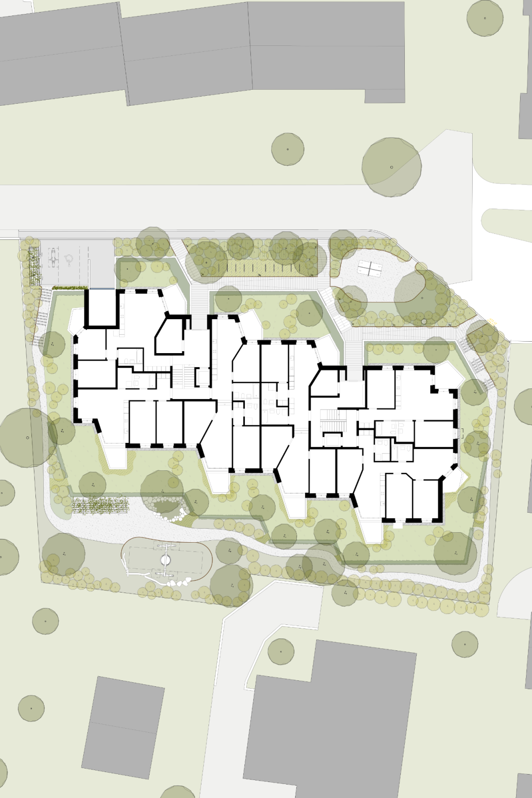 Die Vernetzung der Freiräume geschieht über die grosszügigen Vorgärten zum Strassenraum und zu den hangseitigen Grünbereichen. Über Treppen und leicht geneigte Wege erreichen die Bewohnenden die beiden Hauseingänge. Integriert in das Wegnetz finden sich die Spielbereiche für kleine sowie ältere Kinder und ein siedlungsinterner Aussensitzplatz für die Bewohnerschaft. Im rückwärtigen Aussenbereich profitieren die Erdgeschosswohnungen jeweils von einem privaten Garten. Hecken und naturnahe Pflanzungen schützen die Privatsphäre und unterstützen die Biodiversität des Grünraums.
