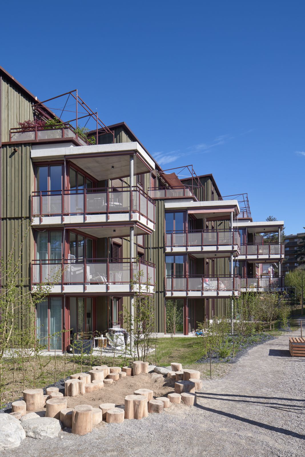 Der architektonische Ausdruck ist geprägt von der hinterlüfteten Fassadenbekleidung mittels vorbehandelter Holzschalung. Für die Gliederung der Fassade werden vertikale Lisenen eingeführt. Als gestalterisches Element werden diese zusammen mit den Fensterbänken und Sturzelementen farblich differenziert behandelt. So entsteht ein feingliedriges Aussenkleid, welches sich mit den vorgesetzten Balkonen selbstverständlich in die Umgebung integriert.
