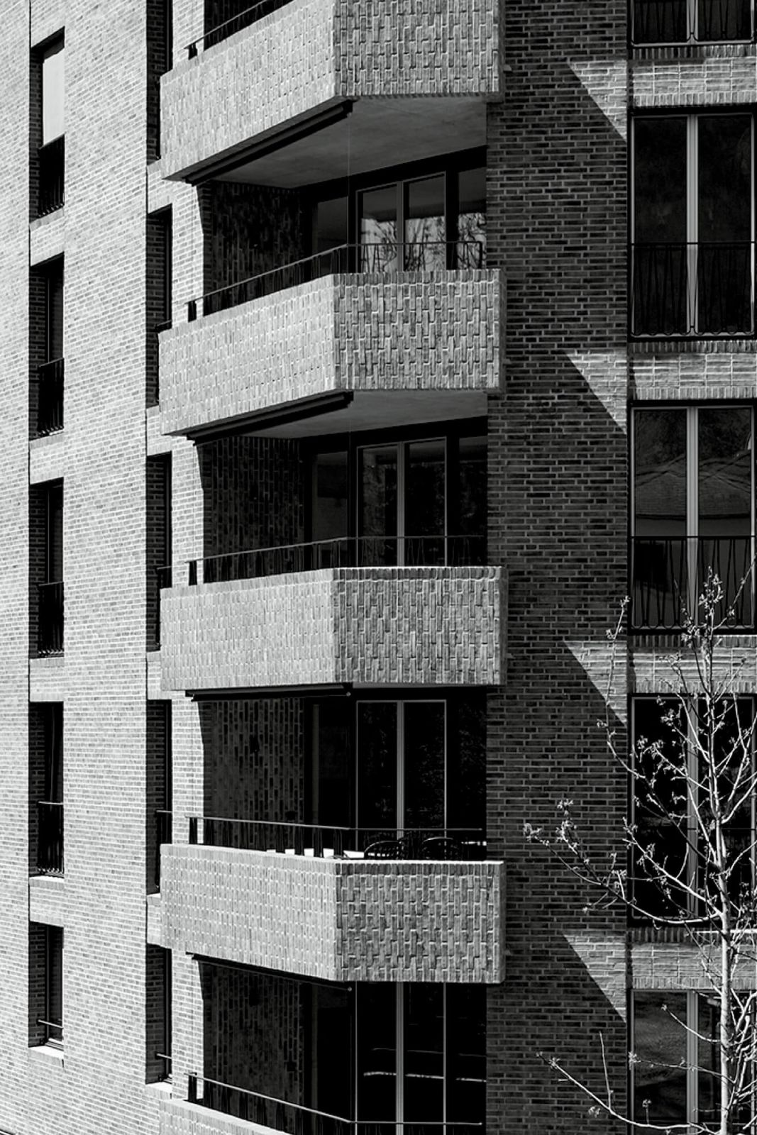 Die Gliederung der Fassade mit vertikalen Fenster- und Fassadenflächen orientiert sich am Bestand des Seniorenzentrums. Die Loggien stehen in den Aussenraum vor und unterstreichen die Senkrechte. Im heterogenen Umfeld der bestehenden Gebäude ist für die Materialisierung der Aussenhaut ein ruhiges Sichtklinkermauerwerk mit Holzmetallfenstern gewählt worden. Auch die eingezogenen Loggien sind mit Klinker ausgekleidet, was eine wohnliche und geborgene Atmosphäre ausstrahlt.