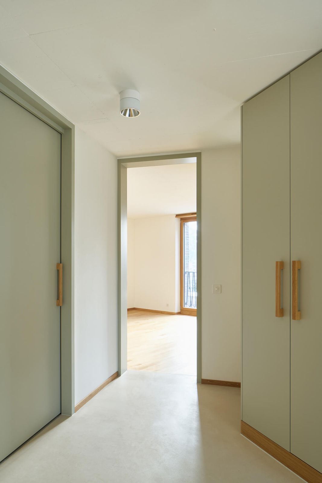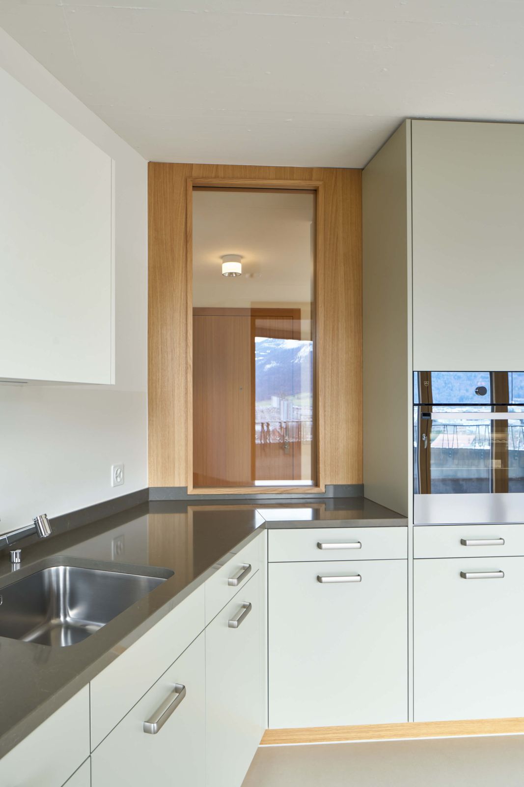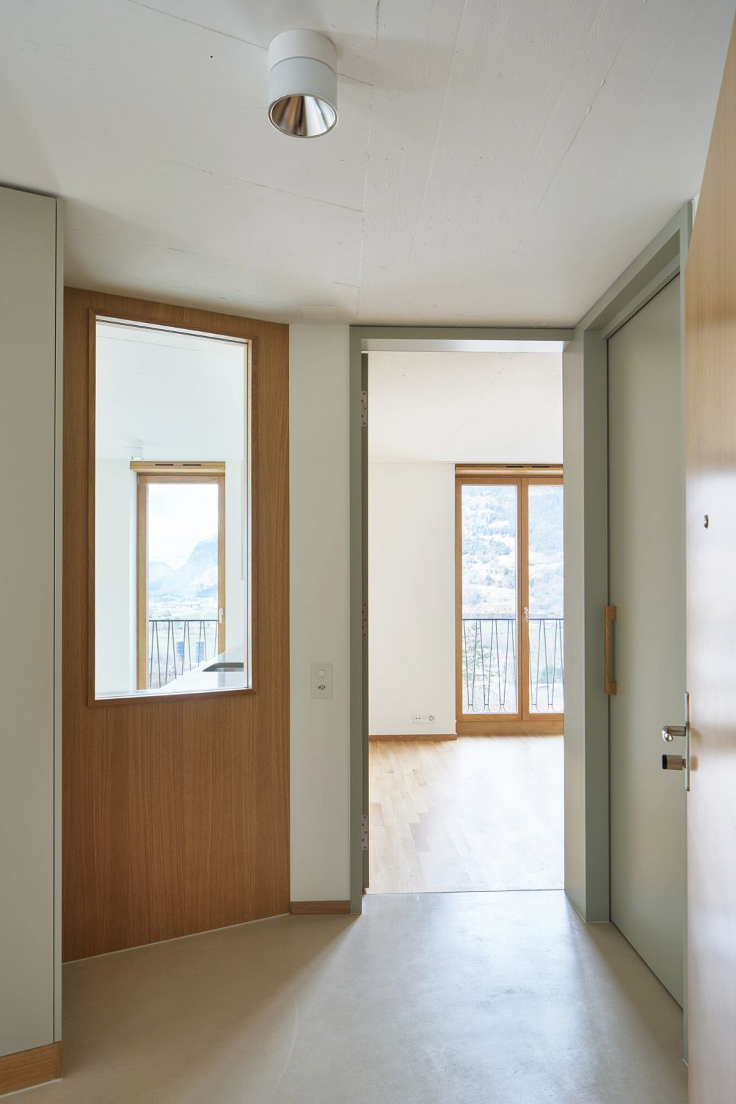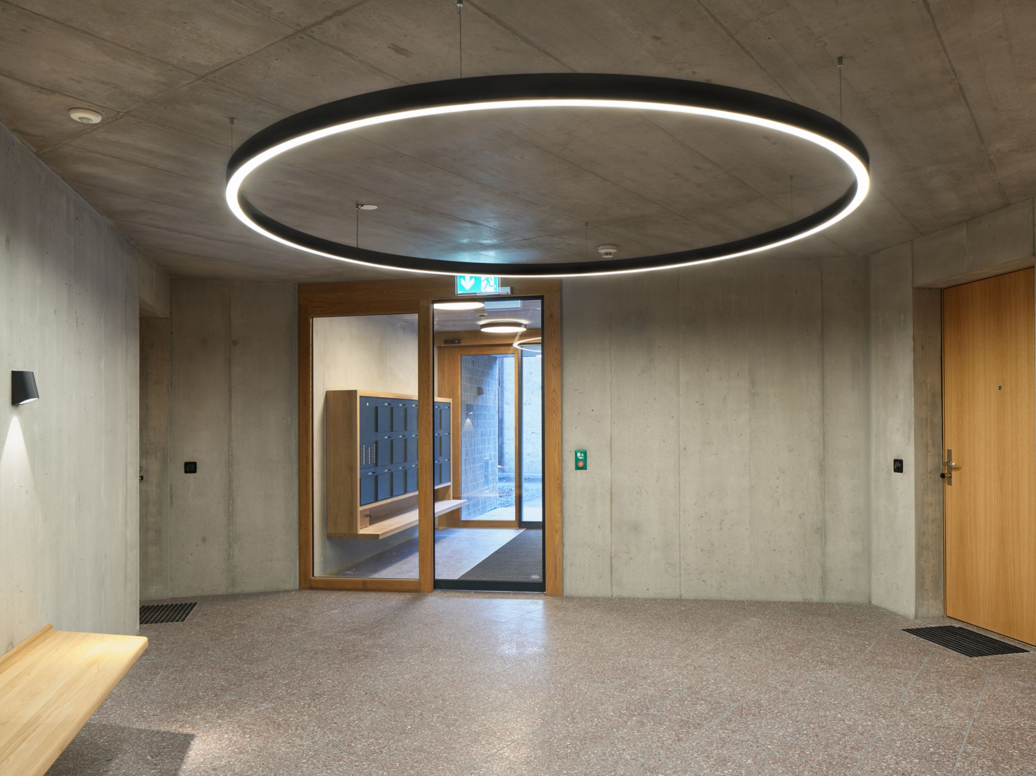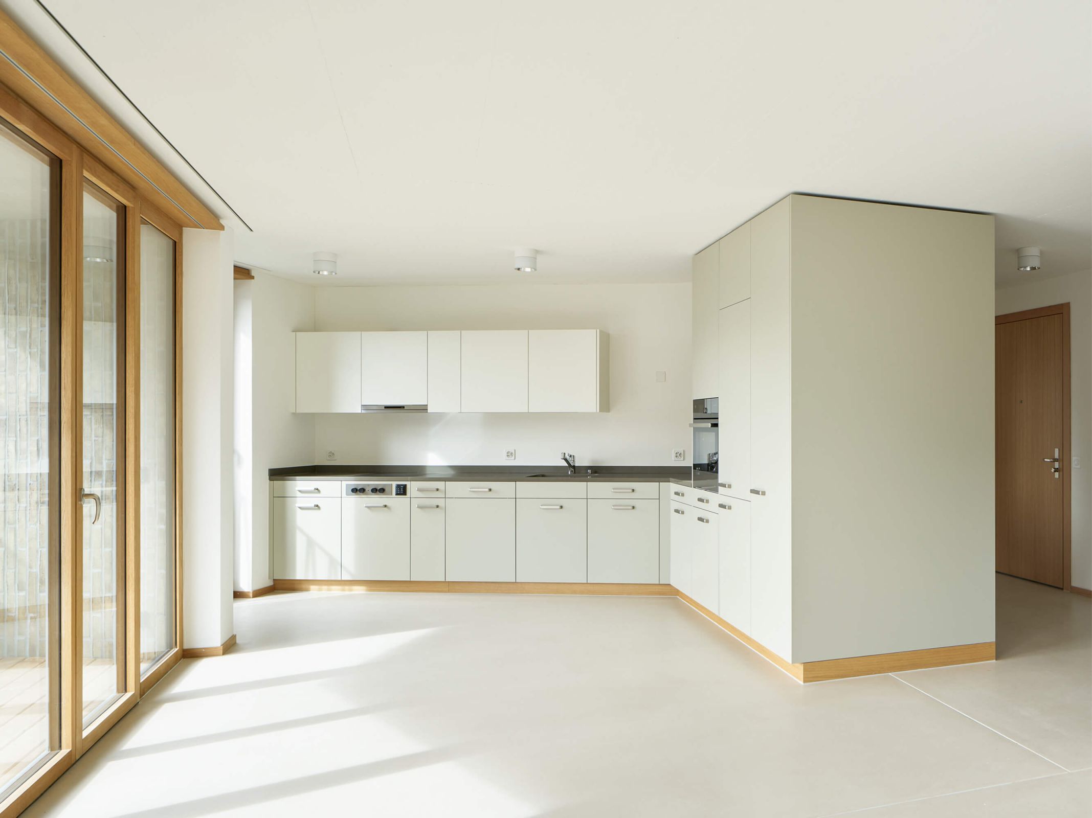 Die Wohnungen sind klar organisiert. Eine Raumschicht um die Halle nimmt Entrée und Nasszellen auf. Entlang den Fassaden reihen sich die Schlafzimmer und Wohnbereiche aneinander. Der offene Wohn-Essbereich mit Küche grenzt an eine windgeschützte Loggia. Die grosszügige Ausführung von Badezimmer und Eingangsbereich erleichtert den Alltag der BewohnerInnen.