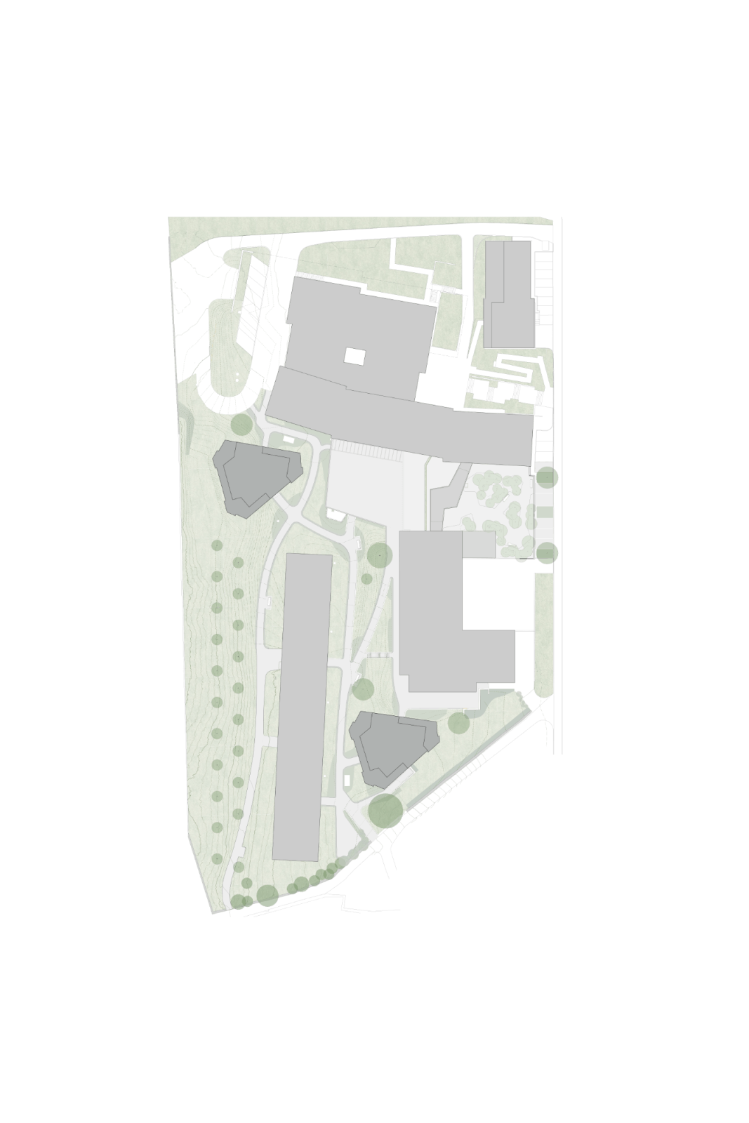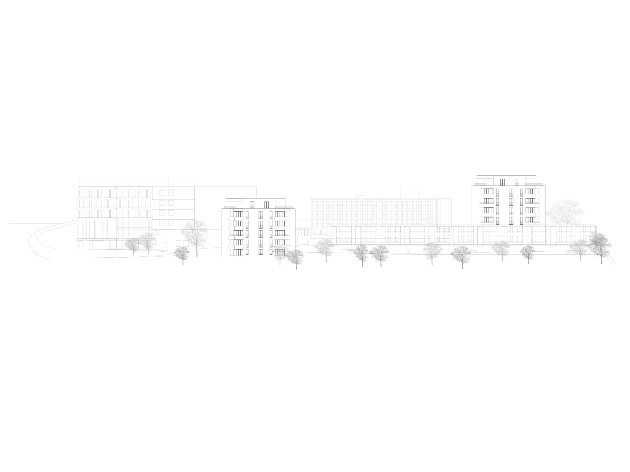Mit diesem städtebaulichen Eingriff wird die gewünschte Arealentwicklung massvoll umgesetzt und das heterogene Ensemble mit den zwei eigenständigen Solitären baulich verdichtet.