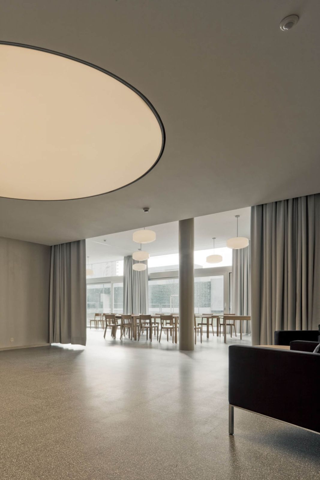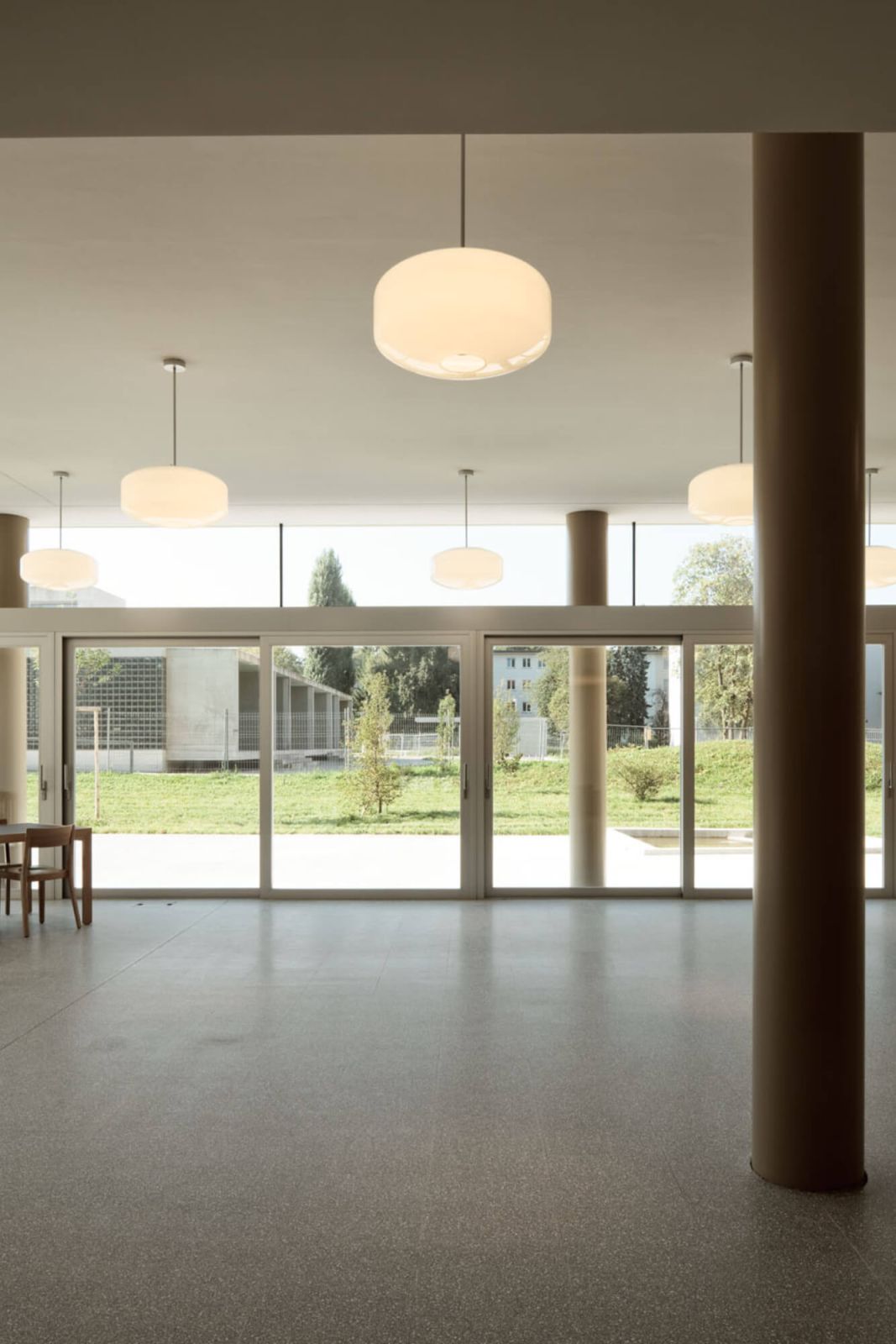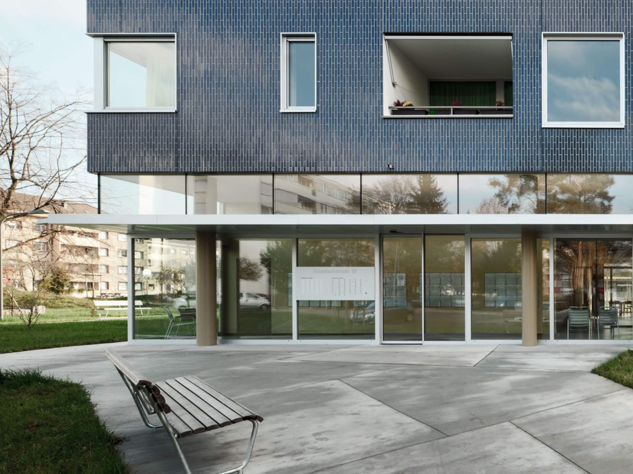 Die Erschliessung des Wohnhauses erfolgt über die Hirzenbachstrasse. Verbindendes Element bildet das im Herzen des Hauses gelegene Foyer. Von hier gelangen die BewohnerInnen zum Saal, zu Spitex mit Pflegebad, Hobbyräumen und Wäschesammelstelle. Der direkte Bezug dieser Nutzungen zum Aussenraum und zu den Eingängen ermöglicht spontane Begegnungen mit Nachbarn und Besuchern.
