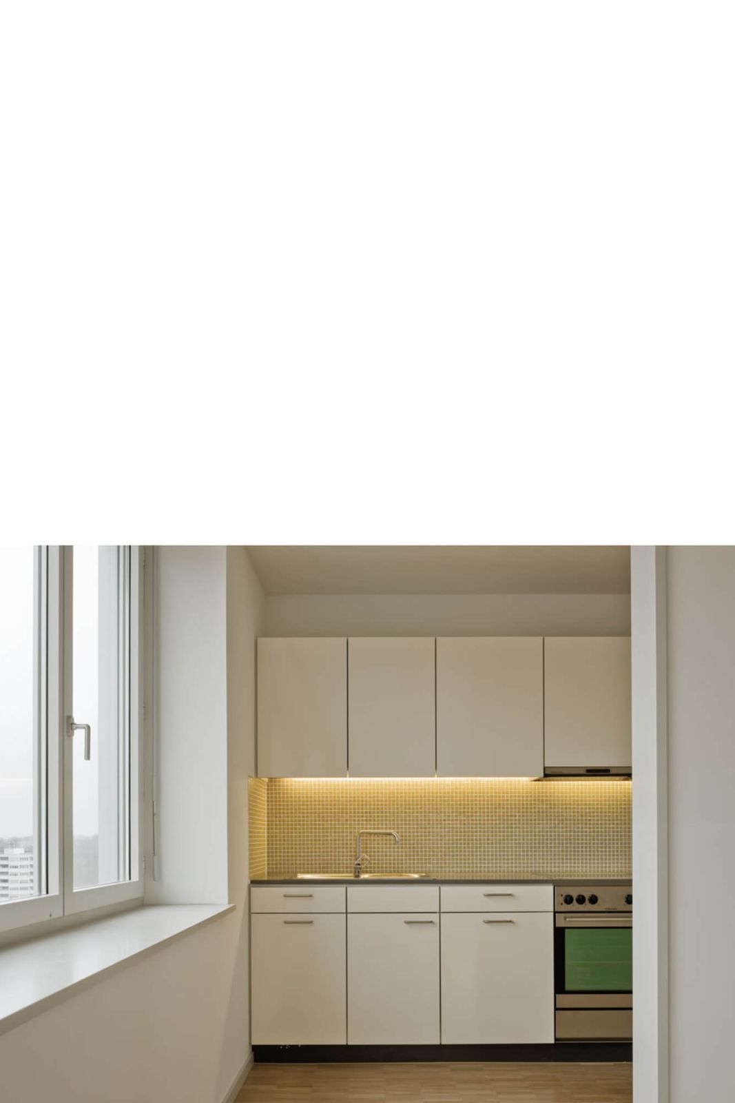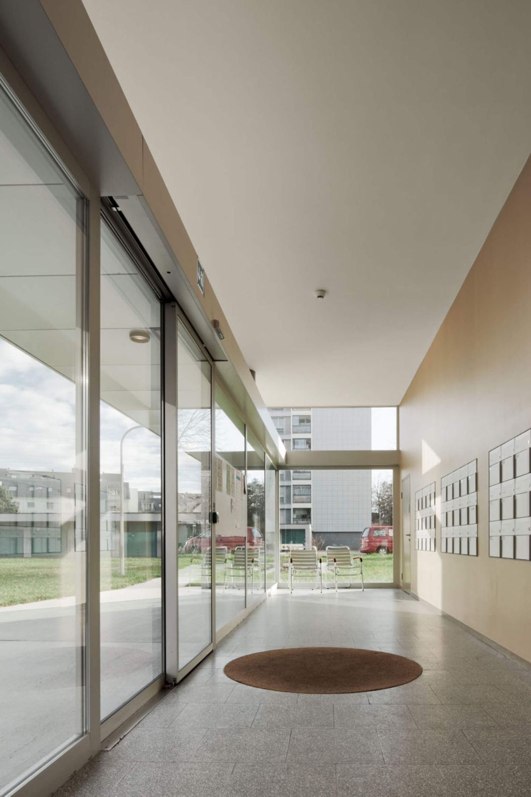 Der Innenausbau der Wohnungen ist einfach und zweckmässig gehalten. Das innenliegende Bad ist über ein Fenster mit der Küche verbunden. Natürliches Licht ist so spürbar. Die Materialisierung der öffentlichen Bereiche mit Kunststeinböden im Erdgeschoss und in den Eingangshallen ist ebenfalls zweckmässig und langlebig. Helle Decken führen das Licht bis in die Tiefe des Gebäudes, warme Farbtöne mit dezenten Gold- und Silberlasuren an den Wänden schaffen eine wohnliche Atmosphäre.