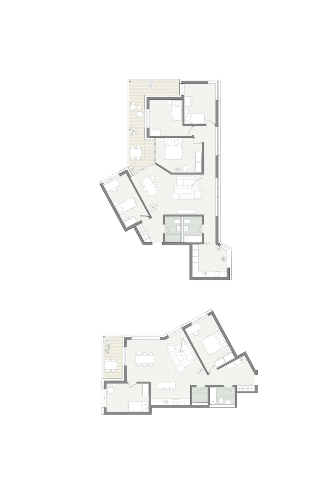 Die beiden Treppenkerne mit Lift erschliessen über dem Erdgeschoss drei identische Wohngeschosse. Die grossen 4- bis 5-Zimmerwohnungen werden beidseitig orientiert und entsprechend den Lärmschutzbestimmungen entwickelt. Die 2.5- und 3.5- Zimmerwohnungen in den beiden Vorbauten sind zum Garten hin ausgerichtet und vollkommen vom Lärm abgeschirmt.
