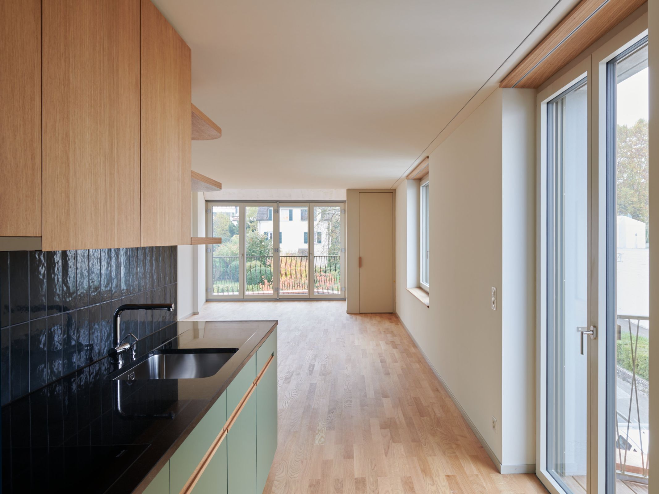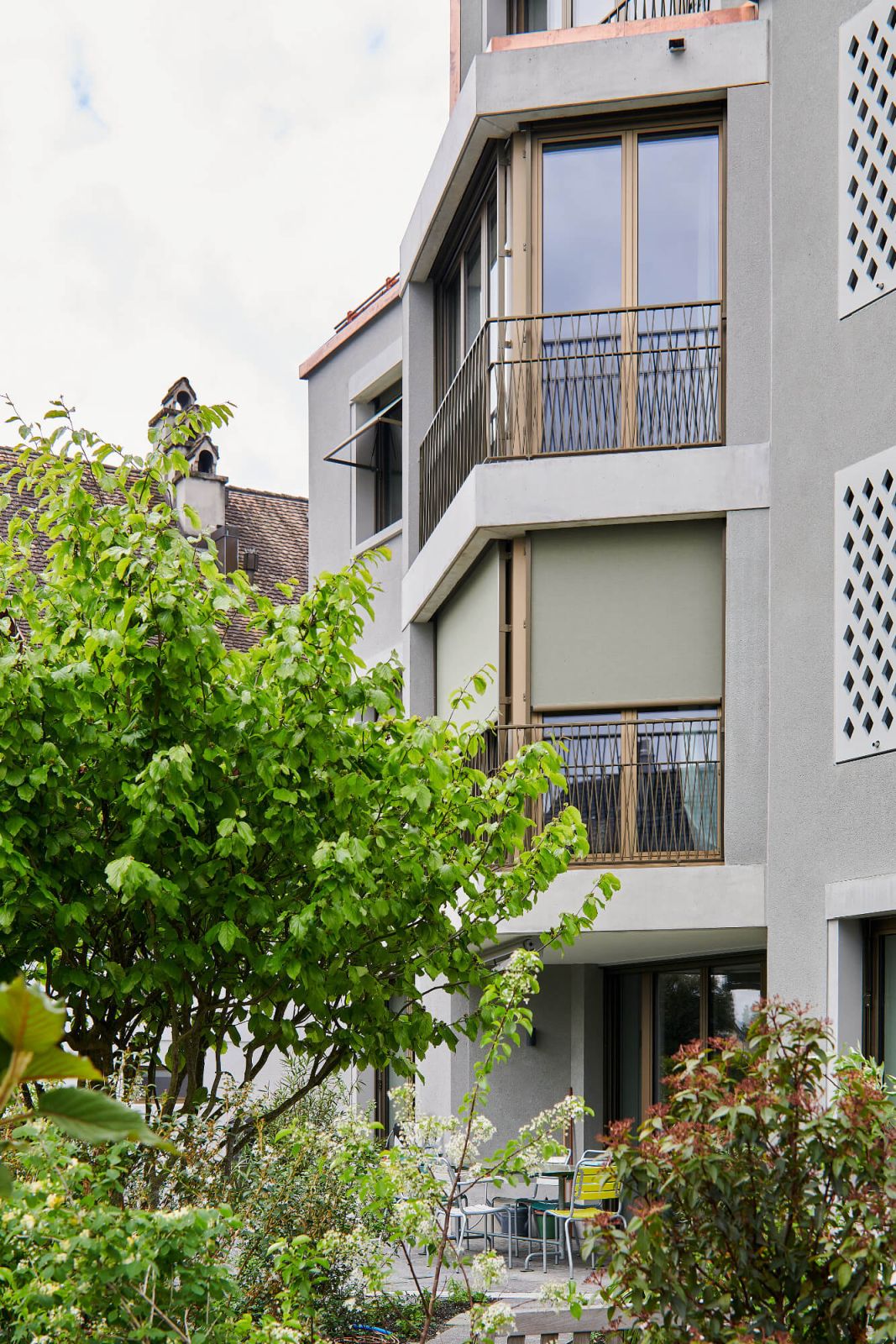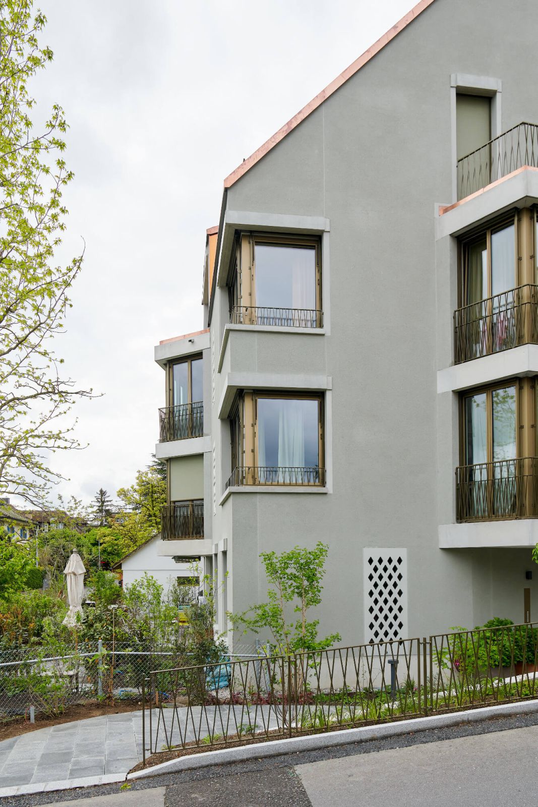 Dadurch kann auf der Ostseite bereits eine kleine Gartenwohnung freigespielt werden. Auf den oberen Geschossen erstrecken sich die Wohnungen von Ost nach West, von der See- zur Abendsonnenseite. Dabei profitieren zwei weitere Wohnungen im 1. Obergeschoss von einem privaten Gartensitzplatz; insgesamt werden sieben Wohnungen erstellt.
