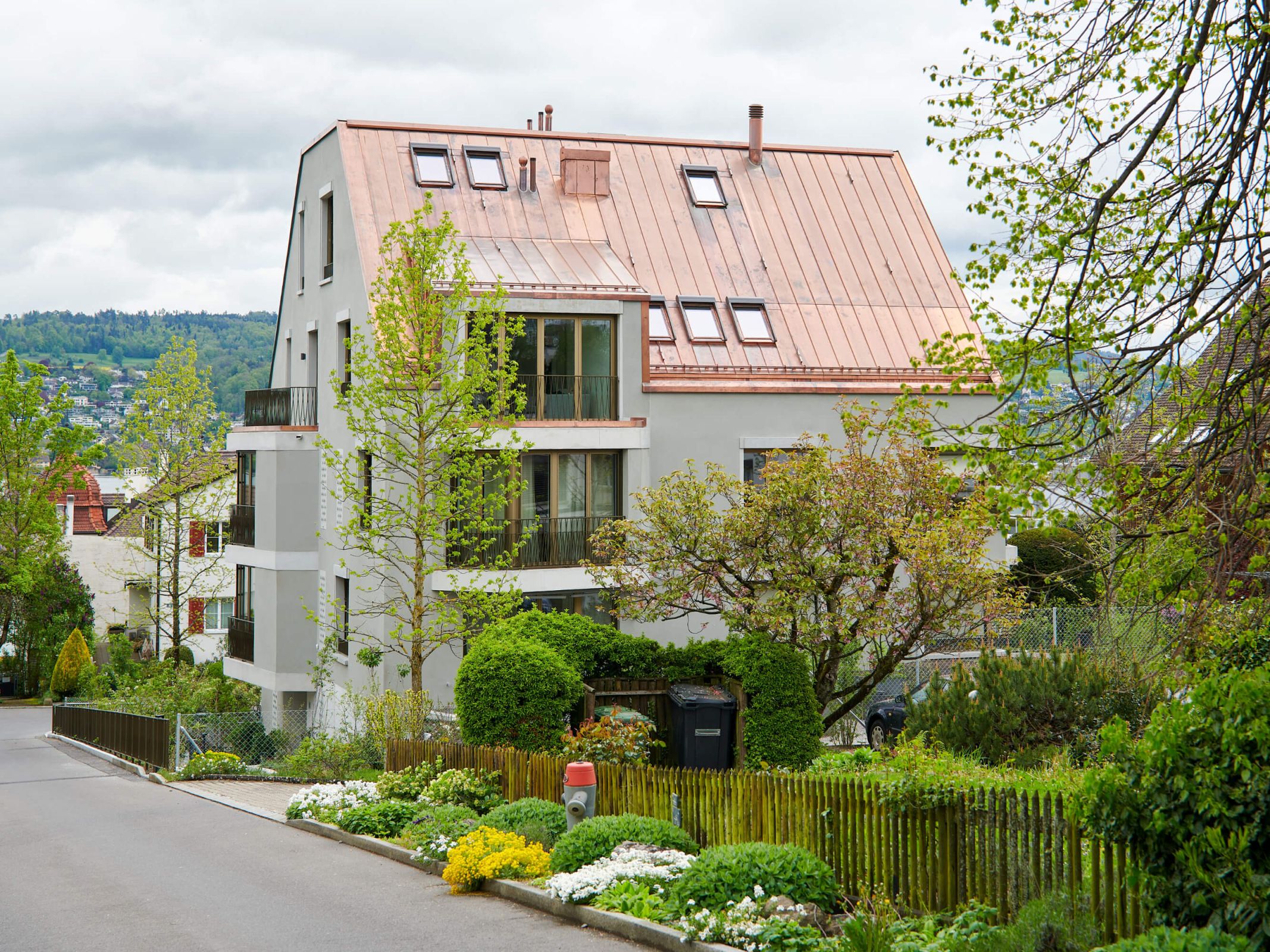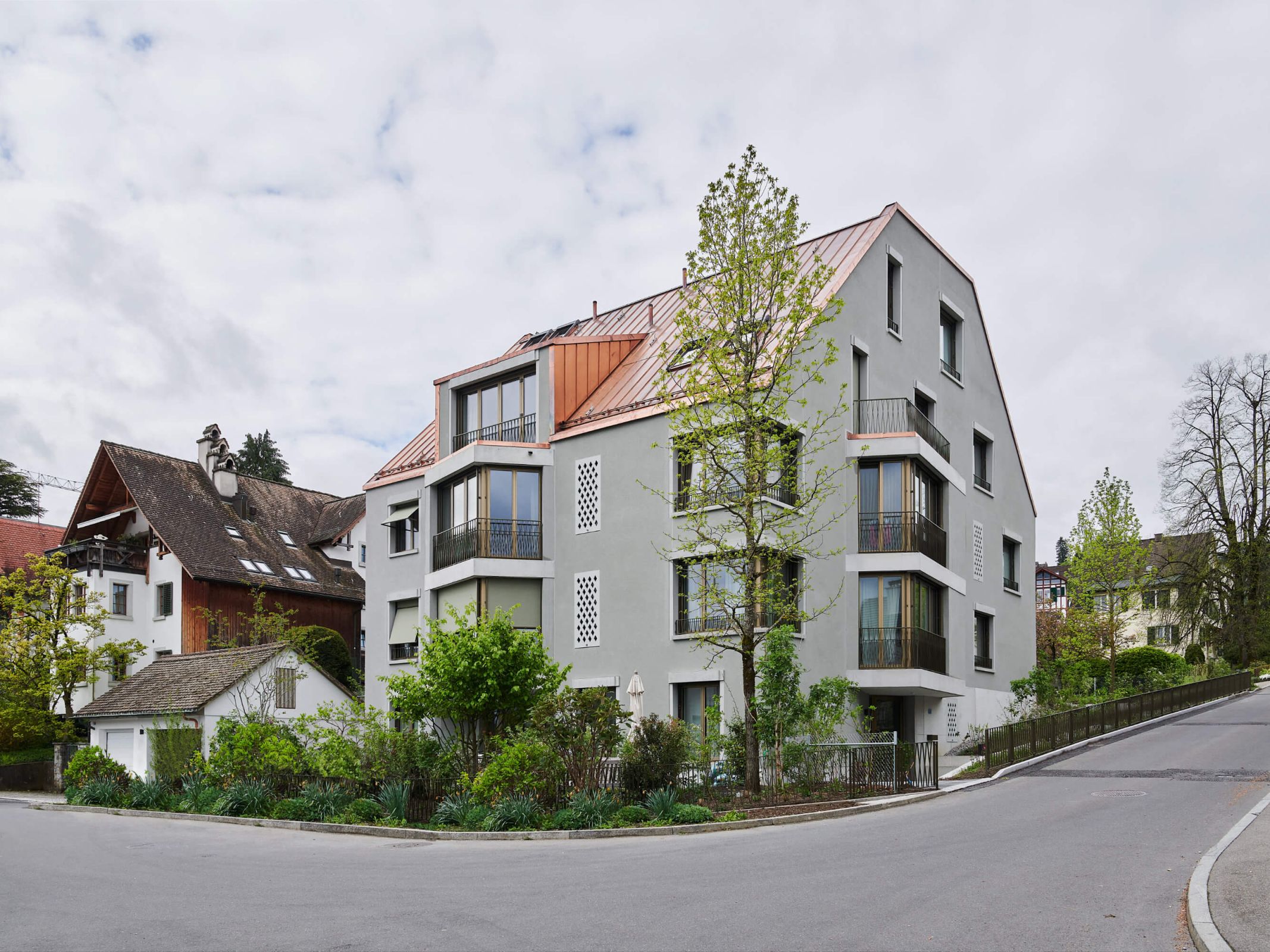 Das Quartier am Turnhallenweg ist geprägt von herrschaftlichen Einfamilien- und Mehrfamilienhäusern mit ihren durchgrünten Privatgärten. Schulhaus und Kernzone des Ortes befinden sich in unmittelbarer Nähe. Die Volumetrie des Neubaus mit seinem parallel zum Hang ausgerichteten First reagiert selbstbewusst auf die Ecksituation und die ansteigende Topografie. Verschieden hohe Erker zeichnen das Haus aus und geben ihm eine vielfältige Gestalt.