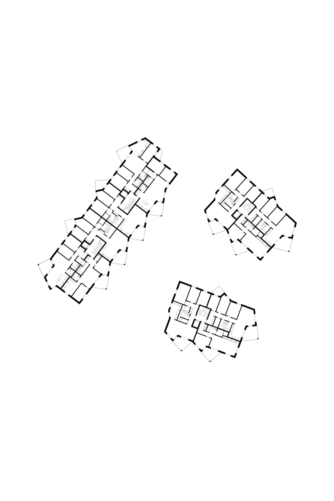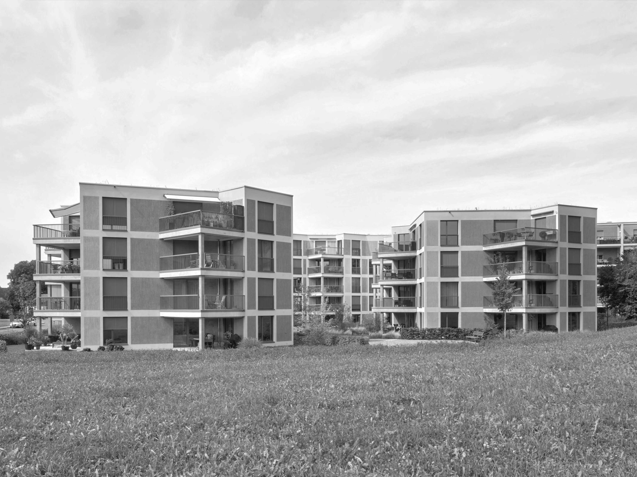 Die zueinander versetzten Punkthäuser mit insgesamt 22 Wohnungen haben ebenfalls eine gute Ausrichtung und Besonnung. Mehrheitlich weisen die Wohnungstypen einen grosszügigen Wohn-Essbereich auf. Nasszellen und Küchen sind in einem Kern zusammengefasst und ermöglichen so viel Flexibilität bei den individuellen Einteilungen der Zimmer.