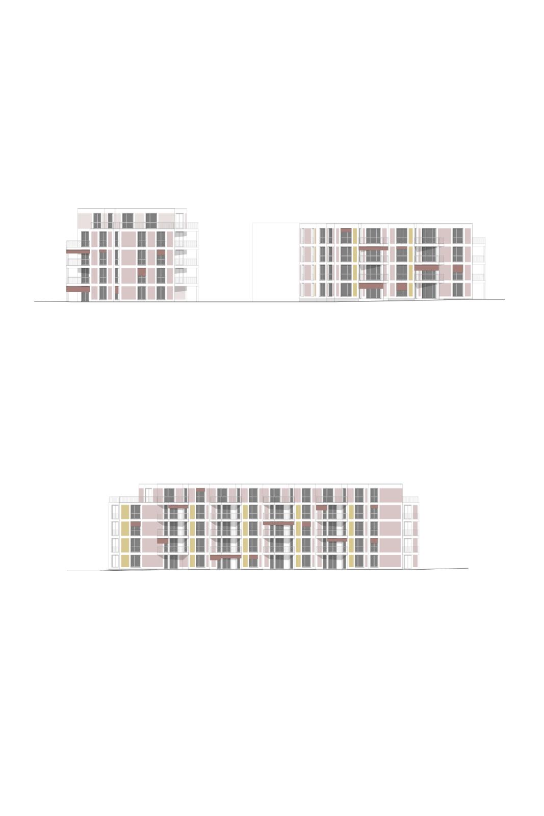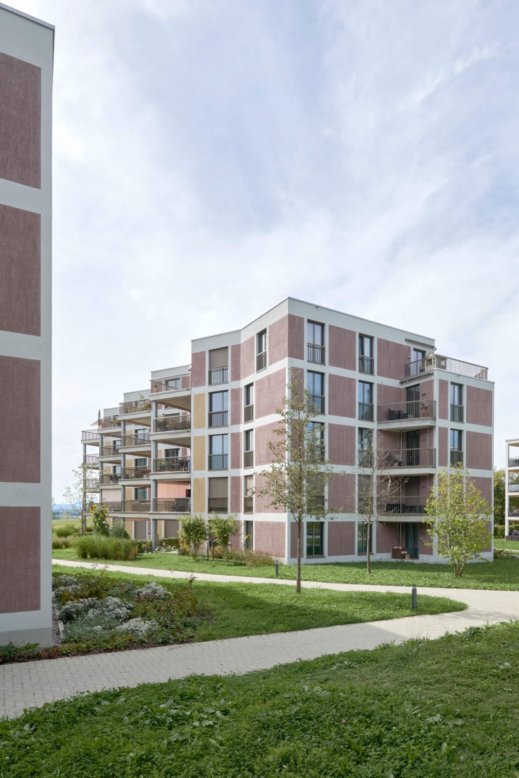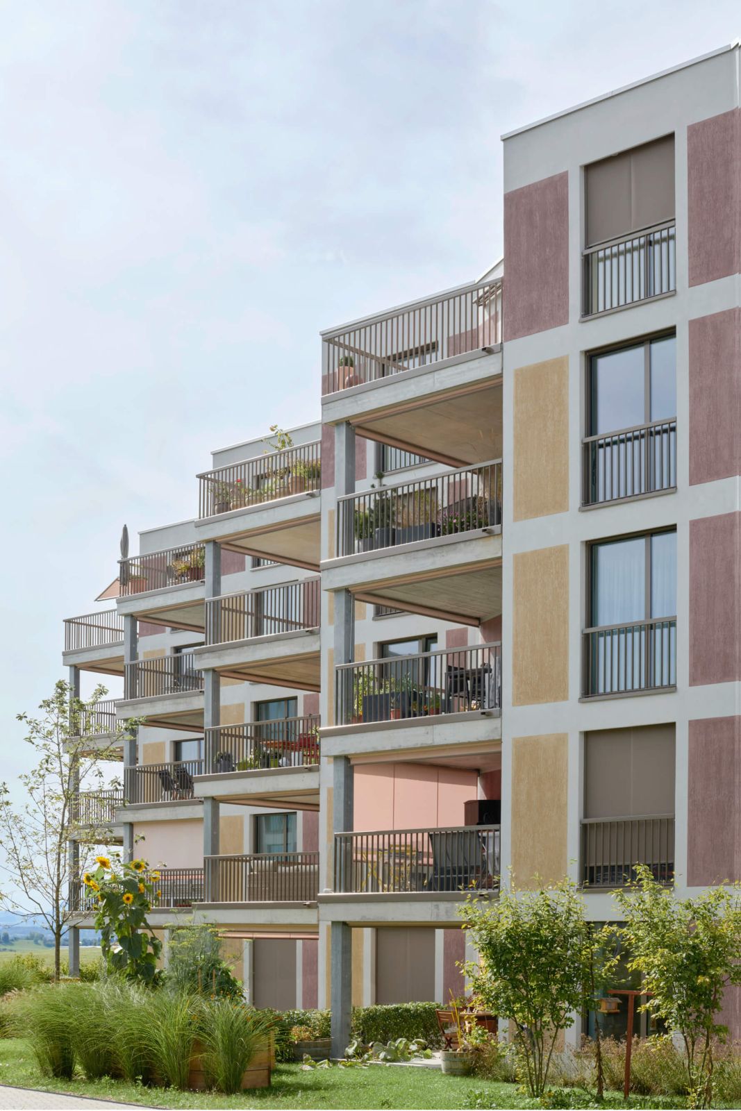 Die fünfgeschossige Zeile beherbergt 28 Wohnungen, welche über 2 Treppenhäuser erschlossen werden. Die Eckwohnungen wie auch die innenliegenden Ost-West-Wohnungen profitieren von mehreren Ausrichtungen und erhalten durch die gestaffelte Fassade eine zusätzliche Orientierung und Besonnung gegen Süden.