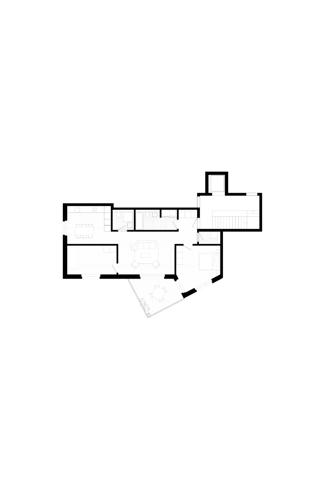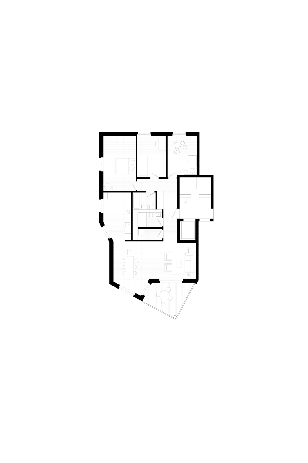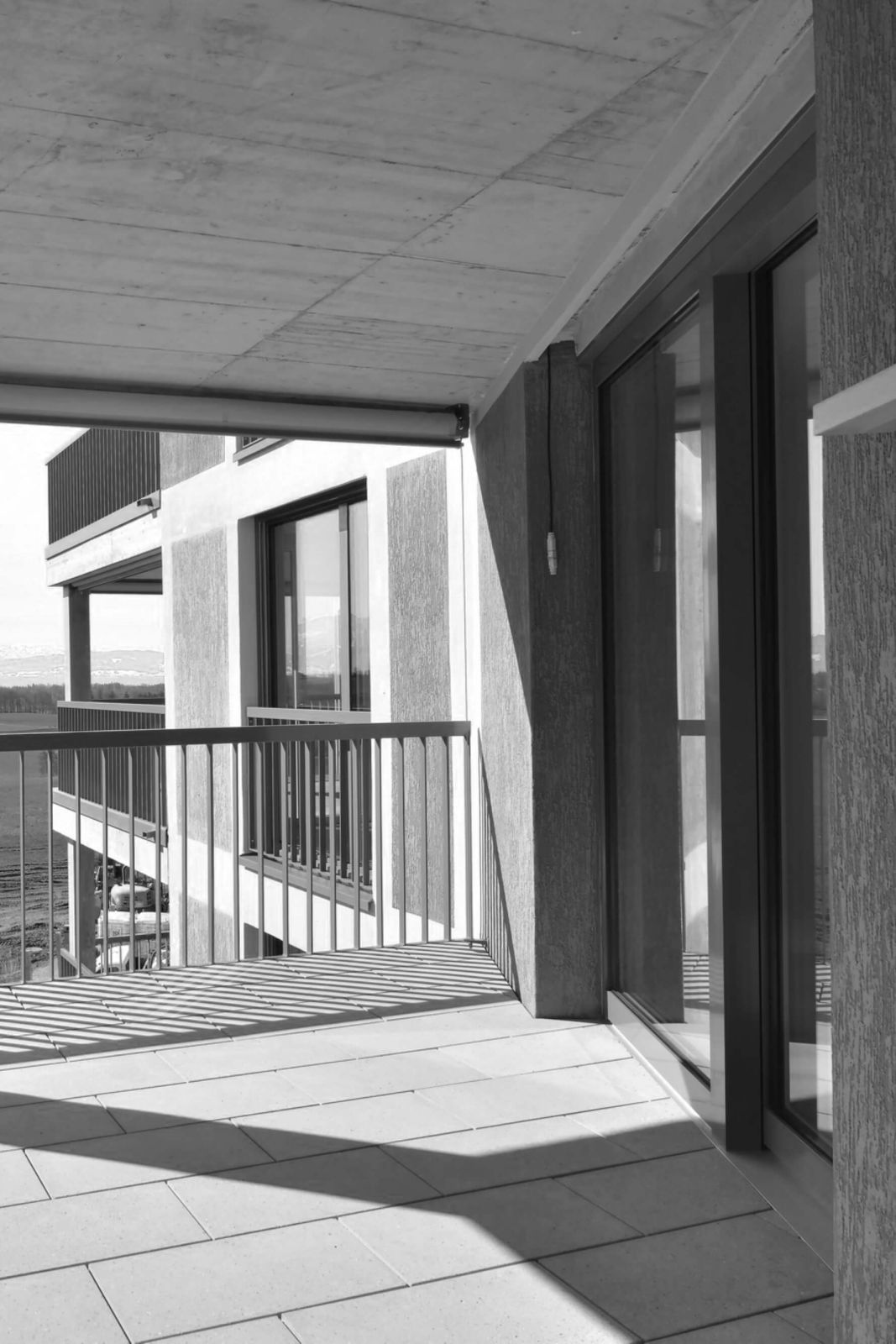 Die fünfgeschossige Zeile beherbergt 28 Wohnungen, welche über 2 Treppenhäuser erschlossen werden. Die Eckwohnungen wie auch die innenliegenden Ost-West-Wohnungen profitieren von mehreren Ausrichtungen und erhalten durch die gestaffelte Fassade eine zusätzliche Orientierung und Besonnung gegen Süden.