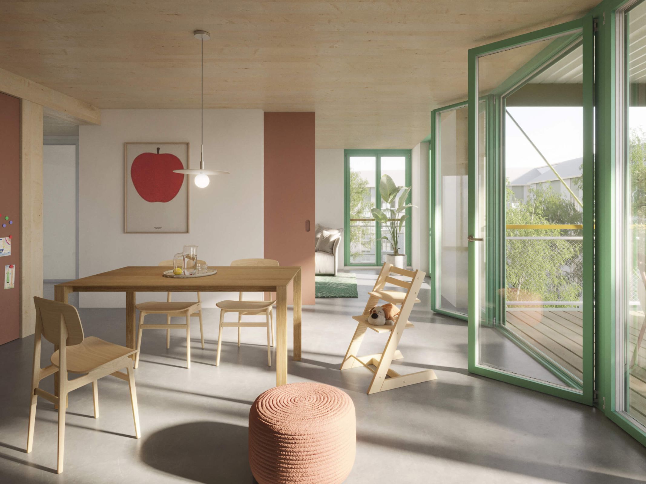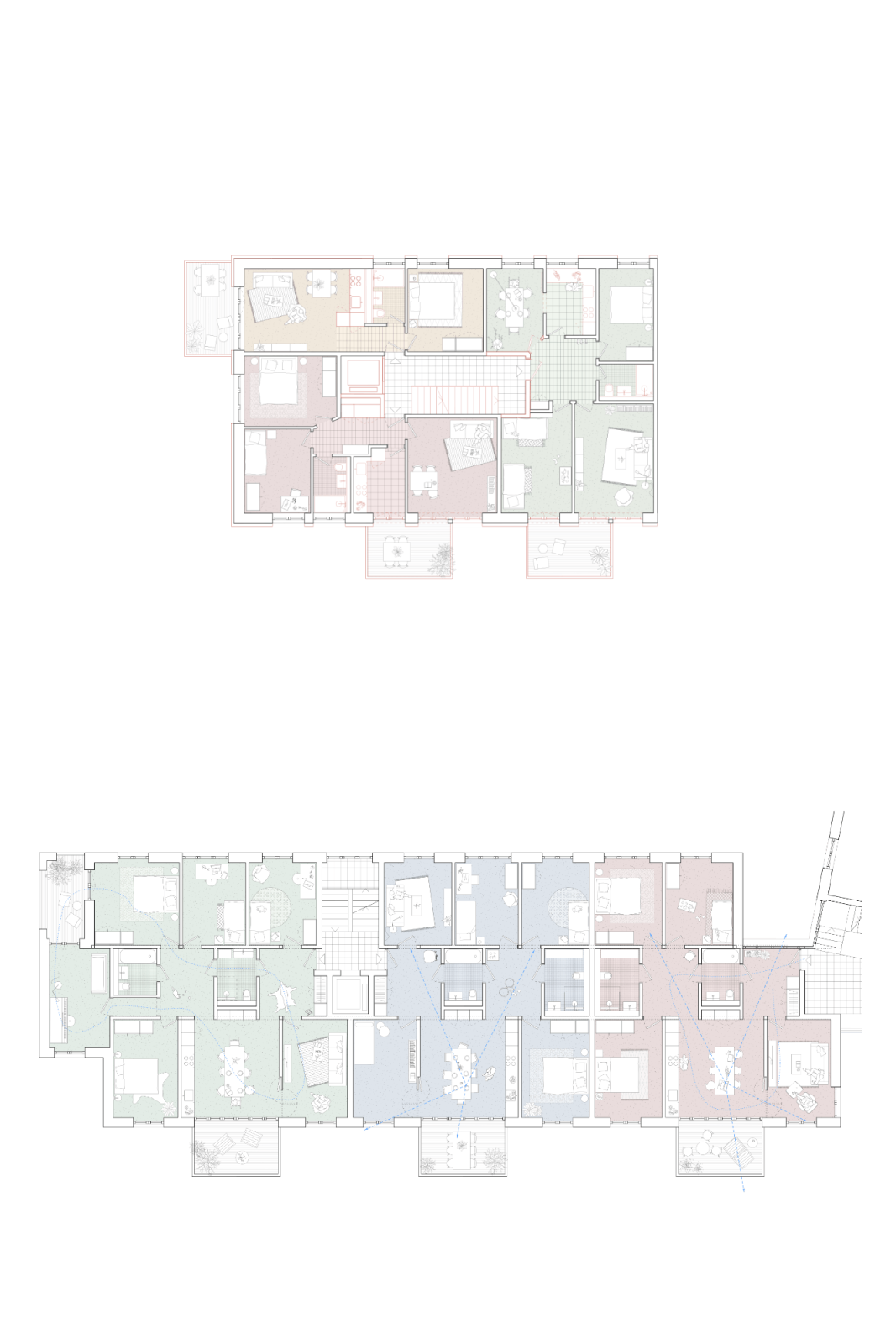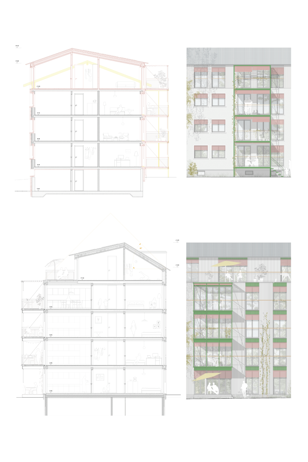 Die Wohnungsgrundrisse basieren auf dem Prinzip flexibel nutzbarer Einzelräume und ermöglichen eine hohe Anpassungsfähigkeit an unterschiedliche Lebensformen. Im Bestand bleiben kompakte Wohnungen erhalten und werden ergänzt, während der Neubau ein breites Spektrum an Wohnungsgrössen anbietet. Wohnungen mit Gartenzugang, durchgesteckte Typologien und Dachwohnungen mit Terrassen schaffen vielfältige Wohnqualitäten. Gemeinschaftliche Angebote und klar zonierte Grundrisse fördern sowohl den Austausch als auch den Rückzug im Alltag.