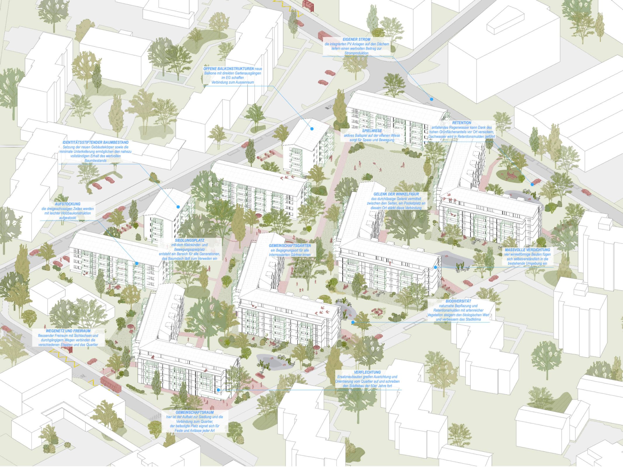 So entsteht ein lebendiges Wohnumfeld mit hoher räumlicher Qualität, das Bestehendes weiterdenkt und nachhaltige Perspektiven für zukünftige Generationen eröffnet.