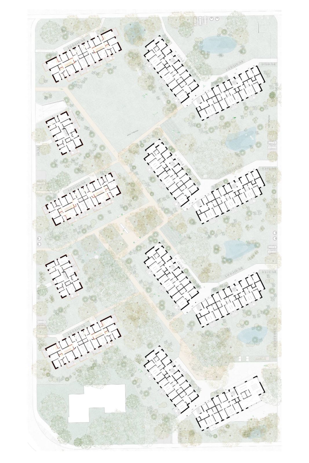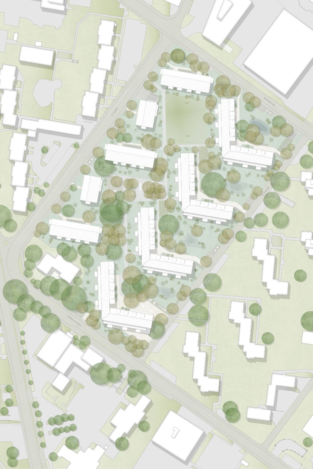 Ein durchlässiger, fliessender Freiraum vernetzt die einzelnen Bauetappen und verbindet die Siedlung mit dem Quartier. Ein feinmaschiges Wegenetz, gemeinschaftliche Treffpunkte und differenzierte Aussenräume schaffen Orientierung und fördern die Begegnung. Der prägende Baumbestand bleibt weitgehend erhalten und wird durch neue, klimaangepasste Pflanzungen ergänzt, wodurch die Identität der Siedlung gestärkt wird.